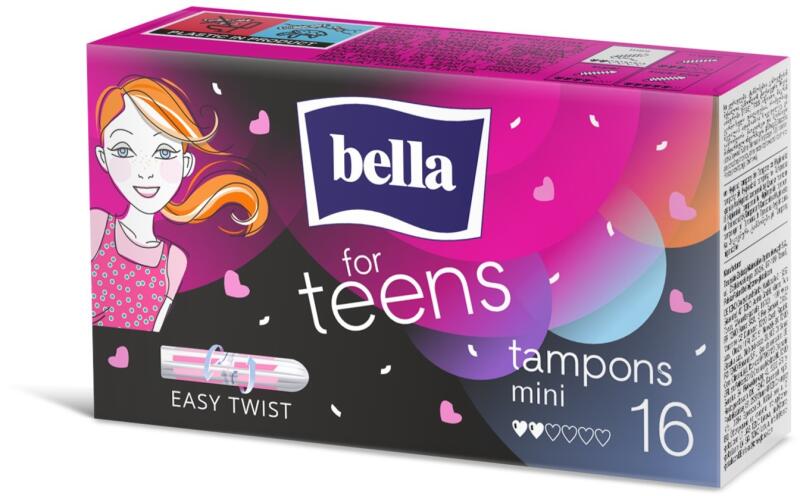 A prémium minőségű, kitűnő nedvszívó tulajdonságokkal rendelkező Bella for teens tamponok maximális szabadságot és biztonságot nyújtanak a menstruáció alatt; a tampon háromféle méretben kapható.